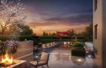 写实建筑效果图,农村自建房四层五开间兄弟联排三户现代轻奢别墅,建筑结构符合农村自建房安全规范,无畸变,整体色调延续深黑阳极氧化铝板+奶白亚克力板+浅灰水磨石;总开间20米(三户分别为7米、6米、7米,呈递进开间设计)、进深9米,四层结构高度14米(局部屋顶露台降层处理);一层做“分户车库+共享庭院”设计,左侧户设单车库(停黑色奔驰S级)、中间户无车库(改为入户玄关+水景造景)、右侧户设单车库(停白色宝马X7),共享庭院位于联排前方(宽15米、深4米,种植芭蕉+椰树+鸡蛋花热带绿植,设休闲卡座区);二层单户各设通长阳台(左侧户阳台宽5米、中间户阳台宽4米、右侧户阳台宽5米,均深2.5米),阳台做“高低错落”进退关系(左侧阳台外凸0.8米、中间阳台平层、右侧阳台外凸0.8米);三层单户各打造转角露台(L型,宽4米、深3米),四层为共享屋顶花园(宽18米、深5米,设无边际水景+藤编休闲椅);外立面深黑铝板做横向分割,落地玻璃为智能调光玻璃,中间户通高两层做挑空客厅设计,室内灯光分区域控温(客厅暖白4000K、卧室暖黄3000K),清晨自然光(色温5500K),16K渲染,移轴镜头拍摄(消除建筑透视畸变),建筑比例严格按1:100施工图还原,材质光影物理渲染真实(铝板磨砂反光、亚克力透光、水磨石纹理均清晰),庭院地面设隐形排水槽,画面无扭曲、无模糊,建筑细节(铝格栅拼接缝、玻璃合页、石材防滑纹)清晰展现