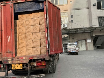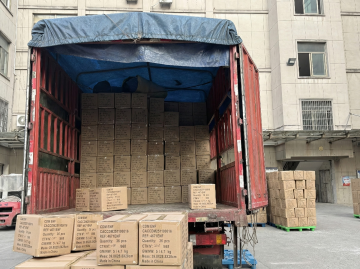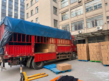 一个大型现代化仓库内部场景,采用写实摄影风格,高清晰度,明亮的工业照明从金属天花板上的长条灯具和筒灯均匀洒下,照亮整个空间。仓库内有高耸的蓝色金属货架,货架上整齐堆放着大量棕色纸箱,部分纸箱上印有黑色文字和标志。地面为灰色水泥地,多个蓝色托盘上堆叠着不同高度的纸箱,形成丰富的视觉层次。仓库空间宽敞,纵深延伸,展现出仓储的规模感和有序性,整体氛围专业、高效、整洁,具有强烈的工业仓储视觉特征。