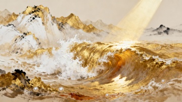 全景构图,一幅融合东方水墨意境与抽象表现主义的金白山水画卷,粗粝的油画笔触勾勒出层叠起伏的山峦轮廓,以厚重的暖金色与纯净的象牙白交织出天地苍茫的壮阔。画面中央,鎏金般的笔触化作奔涌的黄河巨浪,浪花以飞溅的纯白油彩呈现,右上方斜射而下的天光在金色浪尖上洒下耀眼的高光,而波谷处沉淀着琥珀色的阴影。左侧以皴擦技法表现的群山呈现出象牙白与香槟金的渐变层次,右侧留白处隐约可见淡墨色的远山剪影,整体构图遵循"留白透气"的东方美学原则,在粗犷笔触的动感与山水意境的静谧间达成微妙平衡,色调以帝王金为主导,点缀珍珠白与蜜色金的微妙变化,营造出既奢华厚重又空灵悠远的东方山水气象。