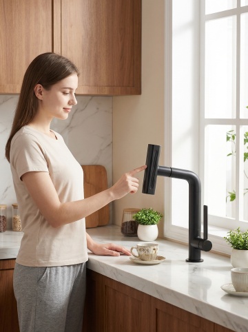 现代感厨房场景,金属风水龙头融合轻拟物设计,简约主义与科技感交织,实景感十足,展现性冷淡风美学中的舒适生活。