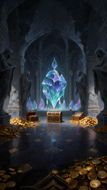 梦幻水晶森林中,两位仙子轻舞于光之阶梯,晶莹巨花绽放神圣光芒,插画风厚涂技法融合水彩柔光,营造唯美元素与静谧超现实意境。