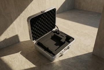 一个银色的硬质行李箱,具有金属质感的外壳,表面有垂直的细条纹设计,顶部配有银色伸缩拉杆,正面有一个矩形的锁扣装置,箱体侧面有银色的提手,底部装有四个黑色万向轮,整体呈现出简洁、现代、商务的风格,高光泽度的表面反射出柔和的光线,立体感强,放置在纯白色的背景上,构图居中,突出行李箱的主体形态和细节特征,适合作为产品素材展示。