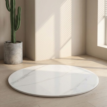 一张极简风格的产品展示图,主体为一件造型简约优雅的圆形台面家具(或类似产品),台面材质改为光滑细腻的哑光白色陶瓷,边缘呈现柔和的弧形过渡,底部搭配纤细的黄铜金属支架,支架设计为交叉几何造型,整体线条流畅现代。背景替换为纯净的浅米色,光线从左上方45度角柔和照射,在产品表面形成自然的高光和细腻的阴影,台面中央有轻微的反光效果,凸显材质的温润质感与高级感,整个画面构图采用经典的三分法,产品位于画面中央偏下位置,底部接触深色沉稳的地面,营造出宁静、精致且具有现代设计感的氛围。