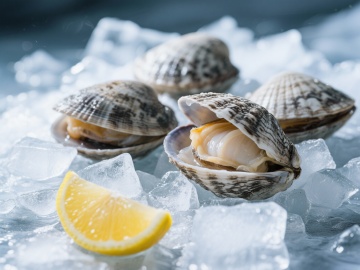 超写实美食摄影风格,俯视角特写构图,鲜活的波士顿龙虾、帝王蟹腿、新鲜生蚝、扇贝肉、大明虾等多种海鲜食材错落摆放于铺满冰块的黑色石板上,冰块表面蒸腾着大量白色烟雾营造出冷冽氛围,红色龙虾与橙色虾类形成鲜明色彩对比,生蚝壳内点缀翠绿香草,高对比度侧逆光勾勒出海鲜的细腻纹理与水珠光泽,背景为深色渐变增强主体层次感,整体画面展现海鲜的新鲜质感与高端食材的奢华视觉效果。