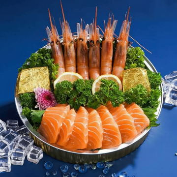 从俯视45度角视角拍摄的多种新鲜海鲜组合,包括帝王蟹、龙虾、三文鱼排、贝类和明虾,海鲜色彩鲜亮饱满,细节纹理清晰可见,保持高分辨率商业摄影质感,浅米色简约背景,柔和自然光从左上方45度角照射,形成自然阴影和高光,突出海鲜的新鲜度和质感,画面构图均衡,主体清晰突出,无任何文字和装饰元素。