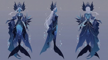 她的腰带略微倾斜着系着,腰带上点缀着星辰星光的装饰。她长裙在膝盖上方漏出她的左腿,裙摆甩向一侧,长裙下隐隐能够看到她左腿上的腿环。长裙上的装饰突出了机械理性与感性(御姐风)的冲突与融合,她的鞋子由黑金条纹组成,显示出她的高雅与温柔。她的袍子上有一个黑金搭配的垫肩,还有一些水晶打造的小小配饰。包括正面和侧面和背面三个角度