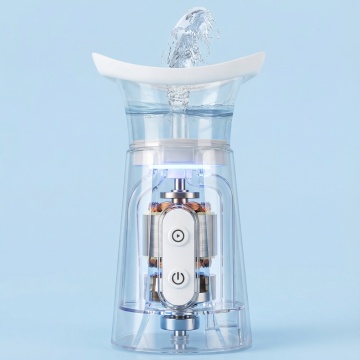 现代简约风加湿器,3D渲染质感,玻璃桌面倒影清晰,蓝紫渐变光影营造未来科技感与清透柔和氛围,轻拟物设计突显舒适生活美学。