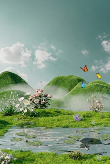 梦幻3D森林,清新水彩风,超现实蘑菇与苔藓共生,营造虚拟自然仙境。