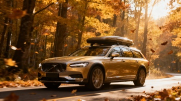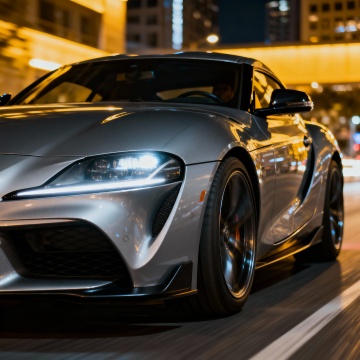 写实摄影风格,一辆红色轿车在公路上行驶,车头朝向画面左侧,车身呈现出流畅的线条和金属质感。背景是壮丽的日落景象,天空中布满了橙红色的云彩,阳光从云层中穿透出来,在地面上投下长长的光影。公路两旁是茂密的森林,树木呈现出深绿色,与天空的暖色调形成鲜明对比。整体画面色彩浓郁,光影效果强烈,营造出一种动感和速度感,同时又带有一丝宁静和壮丽的氛围。