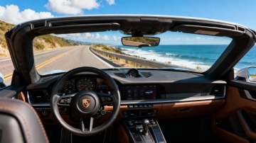 现代感3D风豪车,实景奢华瀑布背景,虚拟现实体验。
