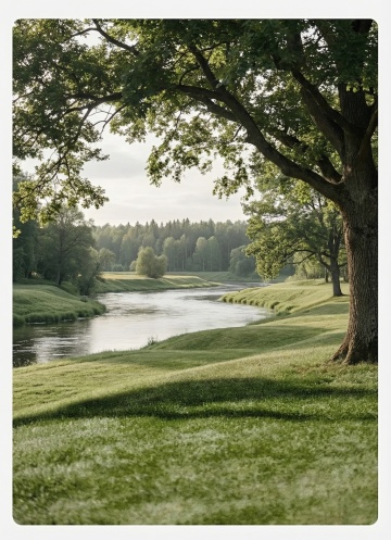 阳光明媚的夏日草原,连绵起伏的绿色丘陵上点缀着茂密的树木,前景是随风摇曳的青草和白色小野花,整体采用写实主义风格,色彩丰富细腻,光影层次分明,草地呈现出深浅不一的绿色渐变,花朵细节清晰,树木立体感强,画面充满生机与宁静氛围