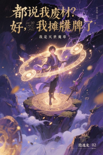 制作一个仙侠小说封面, 书名:“表面废柴杂役,背地是灭世魔尊”,书名:“隐逸龙02”