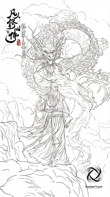 梦幻古典中式插画,仙人御剑飞行,云海缭绕,水墨风格渲染虚拟现实。