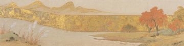 全景构图,一幅融合宋代山水画意境的金色泼墨长卷,以厚重的油画质感笔触构筑出层叠起伏的山峦轮廓,温暖的橙金色霞光从右上方向左下方流淌,在主峰的岩石肌理上形成明亮的高光与深沉的阴影对比,粗犷有力的笔触中暗藏江河蜿蜒的白色脉络,浪花以刮痕效果呈现出飞溅的动态,云海以朦胧的金白渐变铺陈于山谷间,整体画面呈现出"青山遮不住,毕竟东流去"的东方哲学意境,色调由顶至底从耀眼的金箔色过渡到温润的象牙白,肌理间可见刻意保留的颜料堆积与刮擦痕迹,构成既奢华大气又充满自然韵律的视觉交响。