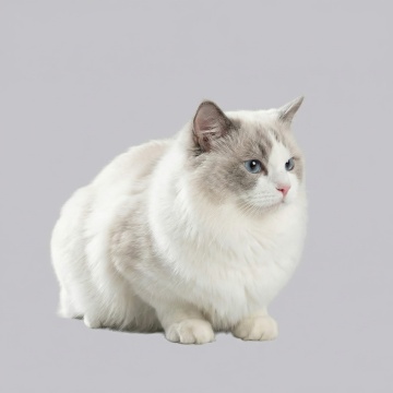 一只蓝眼睛的布偶猫,毛发蓬松柔软,主要为白色,夹杂着浅棕色和深棕色的斑纹,耳朵竖立,表情温和,背景为纯白色。
