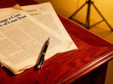 一个正在写字/整理文件的人,桌子上有笔记本、文件夹,传达“梳理信息、准备素材”。