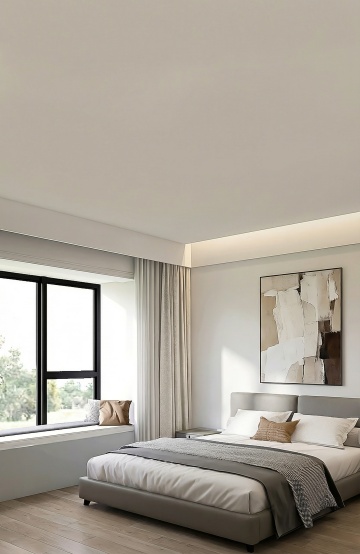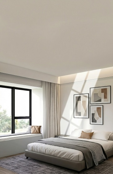 现代简约风格卧室,以浅米色和原木色为主色调,整体明亮温馨。中央摆放一张米色布艺软包床头的双人床,床上铺着米白色床单和浅色针织毯,搭配多个同色系枕头。床的右侧是一个原木色床头柜,上面放着一盏白色台灯和一个白色杯子。床的左侧靠墙处有一个原木色多层搁板架,摆放着绿植、装饰品和书籍。房间左侧有一扇大窗户,挂着浅米色落地窗帘,窗边放着一把浅色单人椅和一个小圆木桌。墙上挂着一幅花卉装饰画和三个立体花朵装饰。天花板有嵌入式灯带,营造出柔和的间接照明效果,地面铺着浅灰色地毯,整体空间干净整洁,光线充足,充满舒适宁静的居家氛围。
