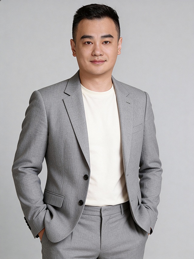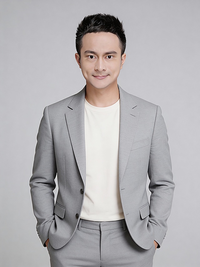 参考第一张图保留人物脸型、发型、年龄特征生成标准职场形象照,参考第二张图人物占位和比例;正脸照;人物居中,提亮肤色,均匀肤色,干净的男士淡妆,气色自然,无明显浓妆痕迹;身穿修身精纺羊毛混纺面料的浅灰色西装外套(平驳领);内搭米白色T恤,下装精纺羊毛混纺面料的高级浅灰色西裤(面料同西装),休闲双手插兜的姿态,肢体自然松弛,站立姿势,从容干练,臀部以上半身像,人物居中,表情动作自然,嘴角上扬,内敛,眼神坚定直视镜头,表情沉稳淡然;淡妆,柔和自然打光,画质清晰,头部完整,高清棚拍专业摄影人像写真,去除人物之外的所有元素,标准焦段50mm,F/4光圈(F/2.8-F/4区间),平视视角(镜头与人物视线齐平);人物占画面70%,人物居中(居中构图),位于画面中心,为视觉聚焦点,入境范围头部及以下至臀部下方10cm(半身像);左右留少量背景空间;头部与画面顶部保留5%空间;头部发型完整,头肩比例协调,结构准确;光比1:1.5,4800K中性光,修饰脸型,肤质哑光细腻,面部雾面柔光,轻透裸肌感,真实毛孔纹理,32K画质,去除人物之外的所有元素,零噪点降噪,极简中灰度纯色背景。严格按照第一张图内容生成。详情