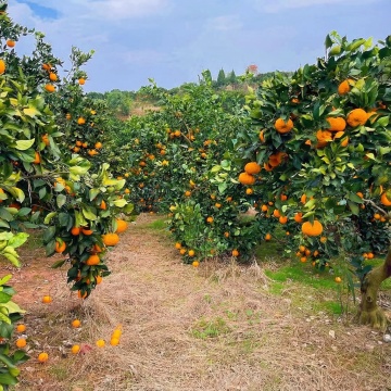 参考这个蓝莓的照片,帮我生成一张果型饱满圆润的沃柑在果园树上枝头挂着的高清照片,稍微六百,整体图片简单高级