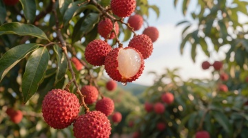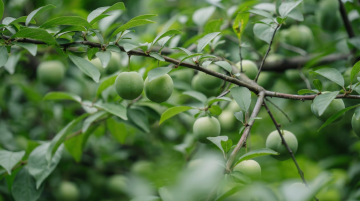 一颗枝繁叶茂的梨树,树上挂满了饱满的梨子,叶子翠绿,背景是蓝天白云,阳光明媚,画面清新自然