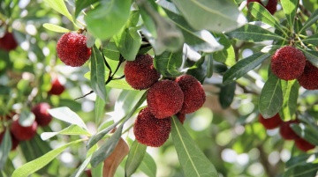 三颗饱满鲜红的草莓挂在藤蔓上,草莓表面布满黄色小点,顶部带有绿色的叶子,周围环绕着更多绿色的草莓叶,背景是明亮的蓝色天空,阳光照射下草莓和叶子呈现出清晰的光影效果和鲜艳的色彩,写实风格,高清细节,充满自然清新的氛围。