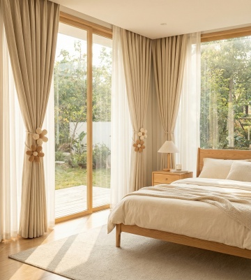 明亮的北欧风格客厅室内场景,极简主义设计,米白色布艺沙发配蓬松靠垫,窗边垂落的白色半透明纱帘,阳光透过窗户在浅色木地板上投下树影斑驳的光影效果,左侧摆放茂盛的绿色室内植物,窗外是模糊的绿色树木和草地,整体色调以米白、浅木色和绿色为主,光线柔和明亮,营造出清新、宁静、通透的居家氛围,扁平化设计风格,简洁的线条,柔和的色彩过渡,低饱和度,无明显纹理细节,强调色块与光影的平面构成感。