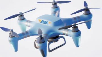 极简风格工业设计渲染,单个现代无人机主体居中构图,规整排布于纯白色纯色背景上,无人机主体为深灰色与黑色的哑光塑料及金属质感,机身上点缀蓝色光带细节,四旋翼螺旋桨结构清晰,无任何文字、logo或水印,整体造型简约、线条利落,具有强烈的现代科技感和产品展示感,光线为柔和的棚拍式正面光,阴影浅淡且统一,确保与系列中其他无人机造型在风格、背景、光照和构图上保持高度一致性。