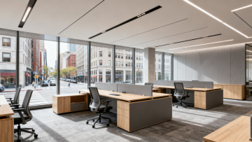 高写实3D渲染风格的现代办公室内部场景,采用明亮通透的采光设计,大面积落地窗引入自然光,窗外可见城市高楼与秋季树木景观。室内以浅灰色、白色和原木色为主色调,搭配深灰色地面,形成简洁专业的色彩和谐。天花板悬挂整齐排列的长方形LED平板灯,与自然光共同营造柔和均匀的光影效果,地面投射出清晰的窗格阴影。开放式办公布局,配备浅色实木办公桌、黑色办公椅、白色文件柜和黑色电脑显示器,书架上整齐摆放书籍和文件夹,窗台及办公桌角落点缀绿色植物增添生机。空间线条简洁流畅,展现出现代、简约、高效的办公氛围,可从不同角度(如靠窗视角、办公室中央视角、走廊视角等)展示,环境可替换为不同城市景观(如商业区、公园旁、海滨等)的办公室背景。