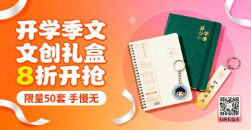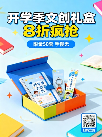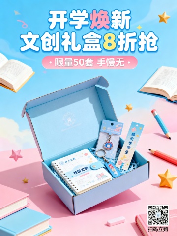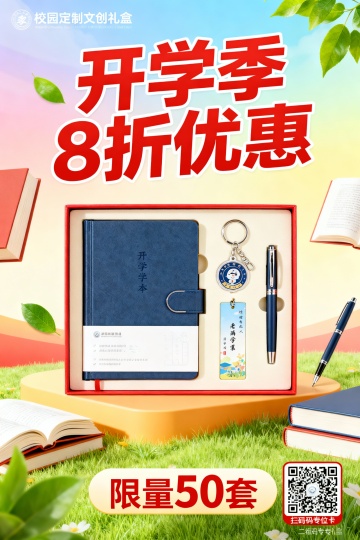 产品信息:校园定制文创礼盒(含笔记本、钥匙扣、书签),促销信息“开学季8折优惠”“限量50套”,目标受众为在校大学生,生成1张促销海报,风格青春活力,包含产品实物元素、促销文案、购买二维码占位符。要有青春洋溢的感觉,突出优惠力度