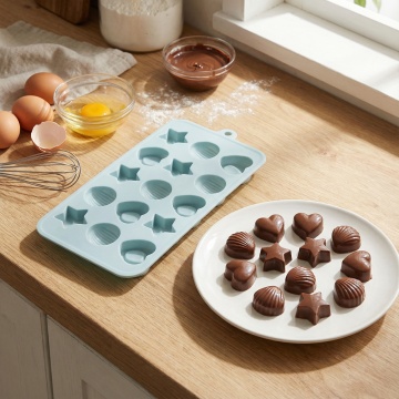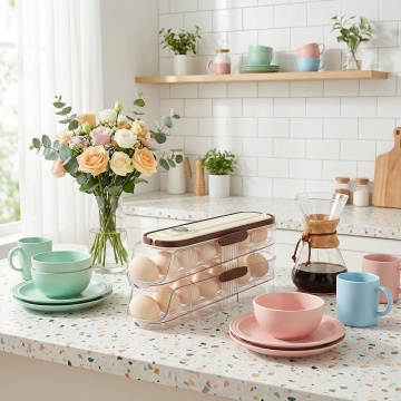 模具与常见物品(如鸡蛋、打蛋器)并排放置,然后还有个盘子放着成品,在厨房桌面上