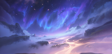 梦幻星空下,极光流淌于云海之巅,插画风与粒子光影交织,营造出神秘静谧的虚拟自然奇景。