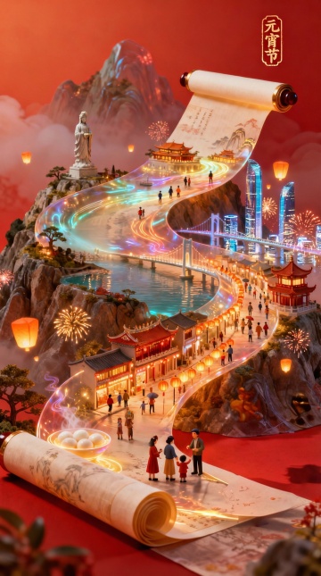 3D微缩艺术风融合中式剪纸与鎏金元素,卡通人物欢庆新春,红墙黛瓦间烟火璀璨,喜庆氛围跃然眼前。