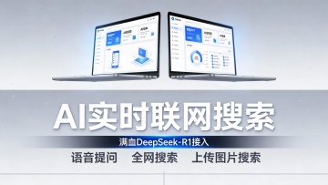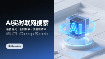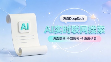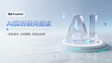 这是一张科技感十足的AI应用功能宣传广告图,采用左右分栏构图,左侧为一部黑色边框智能手机的特写,屏幕清晰展示着一个简洁的APP界面,内含“智能PPT”、“AI结构图”、“AI绘本”等多个功能模块图标与文字说明;右侧是醒目的白色立体艺术字“AI实时联网搜索”,下方配有蓝色高亮条幅强调“满血DeepSeek-R1接入”,并列出了“语音提问”、“全网搜索”、“上传图片搜索”等核心卖点。整体背景为柔和的浅紫色渐变,底部辅以流畅的深蓝色波浪曲线,营造出未来感和动态感。色彩以蓝、紫、白为主色调,搭配黑色手机边框,视觉清新且专业。画面风格现代、扁平化,信息层级分明,旨在突出产品的智能化和强大功能,适用于数字产品推广场景。