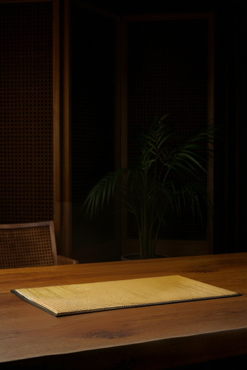 极简主义风格,特写镜头下的深色实木餐桌,清晰展现自然流畅的木纹肌理,桌面光滑有细腻反光,柔和的侧光从左上方照射形成温暖渐变光影,背景为模糊的深色空间,仅有远处几点暖黄色光斑点缀,整体氛围宁静、简约而富有质感,突出木材本身的材质美感与结构线条。