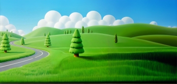 清新插画风,虚拟自然景观,绿树成荫,蓝天白云,营造宁静和谐的夏日氛围。