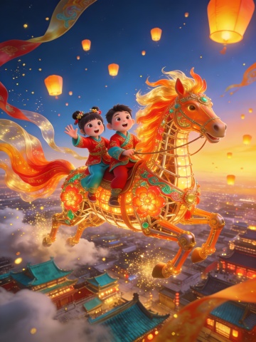 国潮风软3D设计,融合中式元素与梦幻霓虹光效,可爱卡通人物骑乘发光独角兽,鎏金细节点缀,喜庆红底衬托奢华唯美感,展现节日庆典氛围。