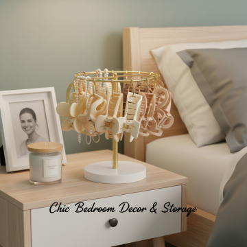 以图中的旋转爪夹收纳架为元素,可收纳展示发饰、手链、钥匙扣、首饰,适用于女孩、女士卧室、宿舍、梳妆台装饰,设计6张跟旋转爪夹收纳架有关的广告图,物体主体特征不变,英语,比例 「1:1」