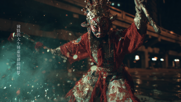 暗夜中的中式鬼魅,刺绣华服与浮雕头饰交织神秘,双重曝光的幽瞳环绕,3D质感强化哥特惊悚,光影沉郁,古典民族风中透出灵魂的低语。