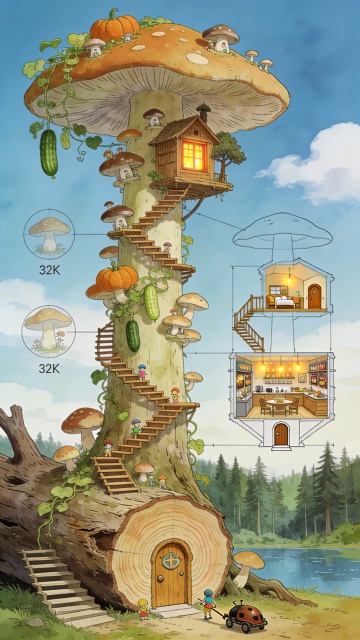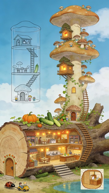 Vince Low绘画风格,近景视角,森林里的一颗巨大的倒塌落地的树干上,一堆大小不一的蘑菇从倒塌的腐朽的树干上长出来,蘑菇与树干的比例大约是1:5,所有蘑菇和树干都有小人国的臣民住在里面,树干正面是有年轮的横切面,横切面底部有个可爱的木门,树干侧面有横剖切图,树干上大大小小的蘑菇中,最大的蘑菇杆上从上到下层层叠叠密密麻麻错层好多个小蘑菇,这些小蘑菇都是一个个的小房间,也藏着很多木质小树屋,贴附着蘑菇杆上。这颗大蘑菇下靠近树干位置密密麻麻还有其余小蘑菇,杆上其余空位置也有开启木质小窗,窗内透出温暖的灯光,蘑菇屋的树屋贴附在蘑菇伞下面的杆上。蘑菇屋的底部都有可爱还带有童话色彩的入户门。倒塌的树杆上从上到下都长满藤蔓植物如南瓜和黄瓜,丝瓜等,既是小人国臣民的口粮,也是他们在树杆上攀爬的梯子。倒塌的树干里面则属于小人国的公共区域,树干里灯火通明,张灯结彩,一楼两边都是小人国的店铺与各种酒肆商铺,整个树干都属于小人国的商业区,树干里的第二层则是一个很大的会客厅,以及大型厨房,属于小人国里重大事情商议区也是小人国臣民有庆典的时候聚餐的地方。而树干上的蘑菇屋则属于小人国里的住宅区,众多蘑菇中延伸出来一个迷你的,透明单线图描绘的竖向剖切图,蘑菇竖剖图内分两层,下面一层是厨房和餐厅兼起居室,第二层带个小木质楼梯,这个楼梯通往二楼的卧室,卧室旁边有个小房间,带木质门,树干里面的两侧看得到每隔一段时距离就有一排排的木质楼梯从一层到二层,方便树干里的人从一楼到二楼,树干离地有点高,也有较宽敞的台阶直通地面。而蘑菇屋的楼梯在树干外面,贴附树干做了室外Z型木质楼梯,方便人们从商铺回自己家休息。蘑菇屋的门,窗,家具都是木质。复古风,清新自然的色彩,蓝天白云的背景,下方是一片巨大的森林以及湖泊。地面上还有各种小人国的车子,由甲壳虫或者金龟子拖行。背景干净,层次感,32K,马克笔手绘线稿,绝美的多层次色彩