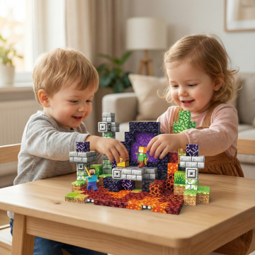 几何风塑料积木拼搭,童趣盎然,实景感十足,传递温馨与舒适,节日氛围轻松愉悦。