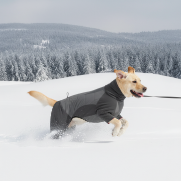 中年美国男子穿着这个鞋,在雪地上遛狗,下着雪,远景一点,男子穿着厚厚的衣服