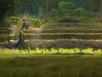写实摄影风格,温暖明亮的金色夕阳低悬于天际,橙黄色霞光铺满天空并与云层交融,地平线处可见传统日式民居错落分布,近处广阔的绿色稻田随风轻摆,一位戴着草帽、背着竹篓的农人弯腰劳作的背影位于画面中间偏下位置,整体画面营造出宁静祥和的田园傍晚氛围,光影柔和,色彩饱和,构图采用三分法,地平线位于下方三分之一处,突出天空的壮丽与田野的生机。
