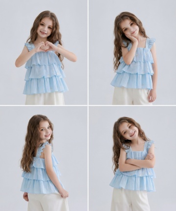 用这张图片生成4张不同动作的图片,女孩大概5-6岁脸上略显稚嫩,皮肤白皙细腻,笑容甜美
