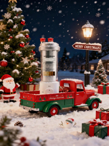3D重拟物风玻璃瓶身,金属质感与梦幻雪景交融,红金配色传递喜庆温馨,圣诞元素点缀节日氛围。