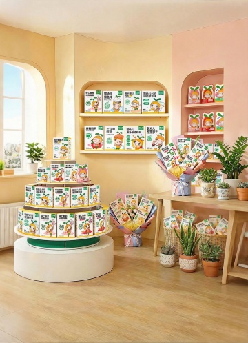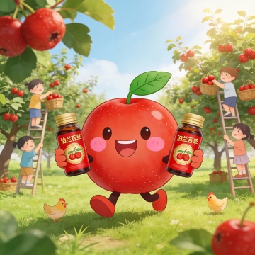 [上层场景,占比40%]:阳光明媚的果园,苹果等水果挂满枝头,果实饱满新鲜,在阳光下闪闪发光。天空晴朗,光线温暖柔和,营造出自然清新的氛围。身穿红色围裙的年轻亚洲女性果农,弯腰俯身,上半身跨越界面从果园延伸到底部场景,右手拿着参考图样式的包装,从上层画面底部伸出,从中间信息条的上方穿过,传递到下层场景,女性眼神看向下层场景;下层场景中的年轻女性的手抬起接着上层场景递过来的参考图样式的包装。