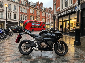 赛博朋克风夜景中,骑手疾驰于未来都市,金属质感机车与霓虹光影交织,头盔静置路面,虚实交错,科技感与酷炫感并存。