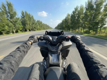 一辆鲜红色的运动型摩托车,车身线条流畅,带有流线型整流罩和锐利的前大灯,停在一条空旷的沥青道路中央,道路两旁是茂密的树木,阳光透过树叶缝隙洒下温暖的金色光芒,形成斑驳的光影效果,整体画面呈现出强烈的动感与自然光影的和谐美感,具有高度写实的摄影质感,背景营造出一种开阔、自由且充满力量的氛围。