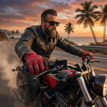 保持手套细节不变,分清正反面,一个外国帅哥穿着这双手套,戴着头盔在城市骑机车