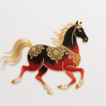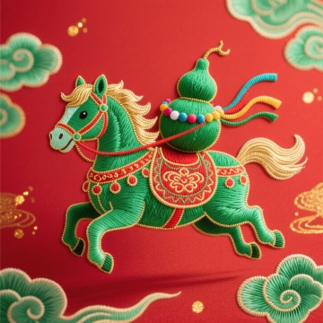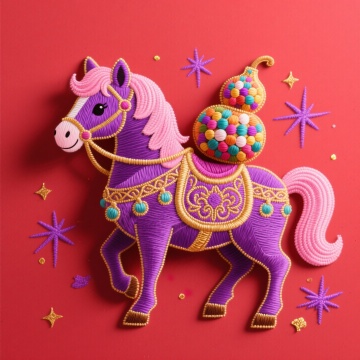 刺绣风马匹,融合工笔细腻与重拟物质感,喜庆红黄配色彰显国潮韵味,民族纹样点缀,尽显中式节日欢愉。