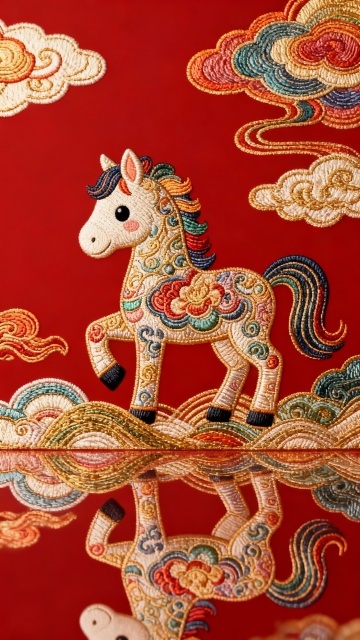 刺绣风与国潮风融合,卡通小马身披工笔纹样,踏云而行,倒影映水,红底祥云烘托喜庆氛围,兼具古典与可爱感。